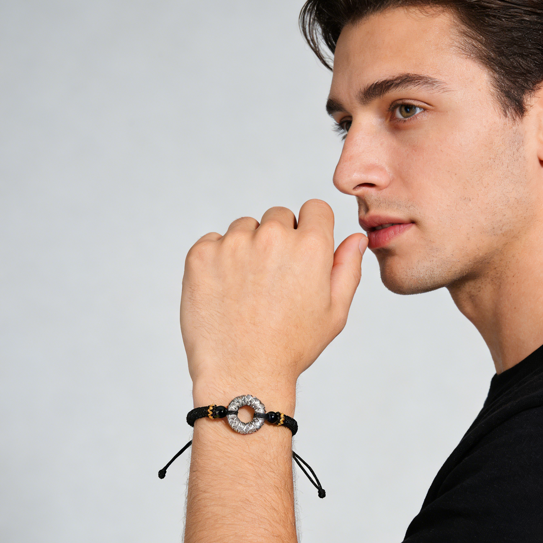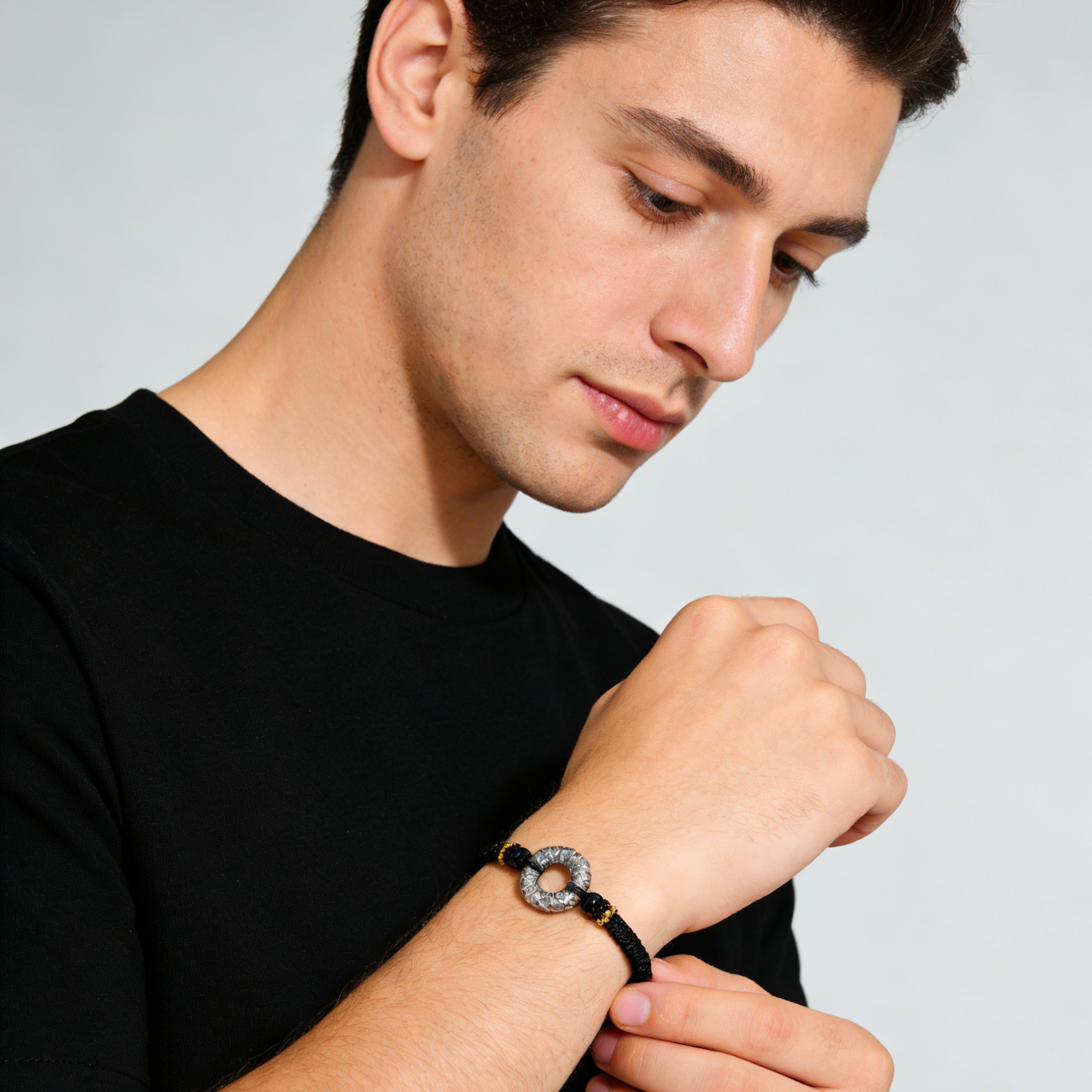 In Western culture, the dragon is often regarded as a symbol of power, protection and good fortune, which resonates with the cultural connotation of the dragon in Chinese traditional culture as a guardian of luck. The dragon scale pattern on the peace buckle is inspired by the ancient Chinese legend that dragon scales are the armor that protects the dragon, representing indestructible protection and endless vitality. This bracelet combines the traditional Chinese hand-weaving craft with the exquisite 999 sterling silver dragon scale peace buckle. The hand-woven black cord is not only a symbol of calm and stability in Western aesthetics, but also inherits the Chinese traditional culture of using red or black cords to ward off evil spirits and bring good luck. We hope this bracelet can bring the wearer the double protection of Eastern and Western cultural beliefs, and become a spiritual sustenance that guards the wearer’s peace and good luck.
