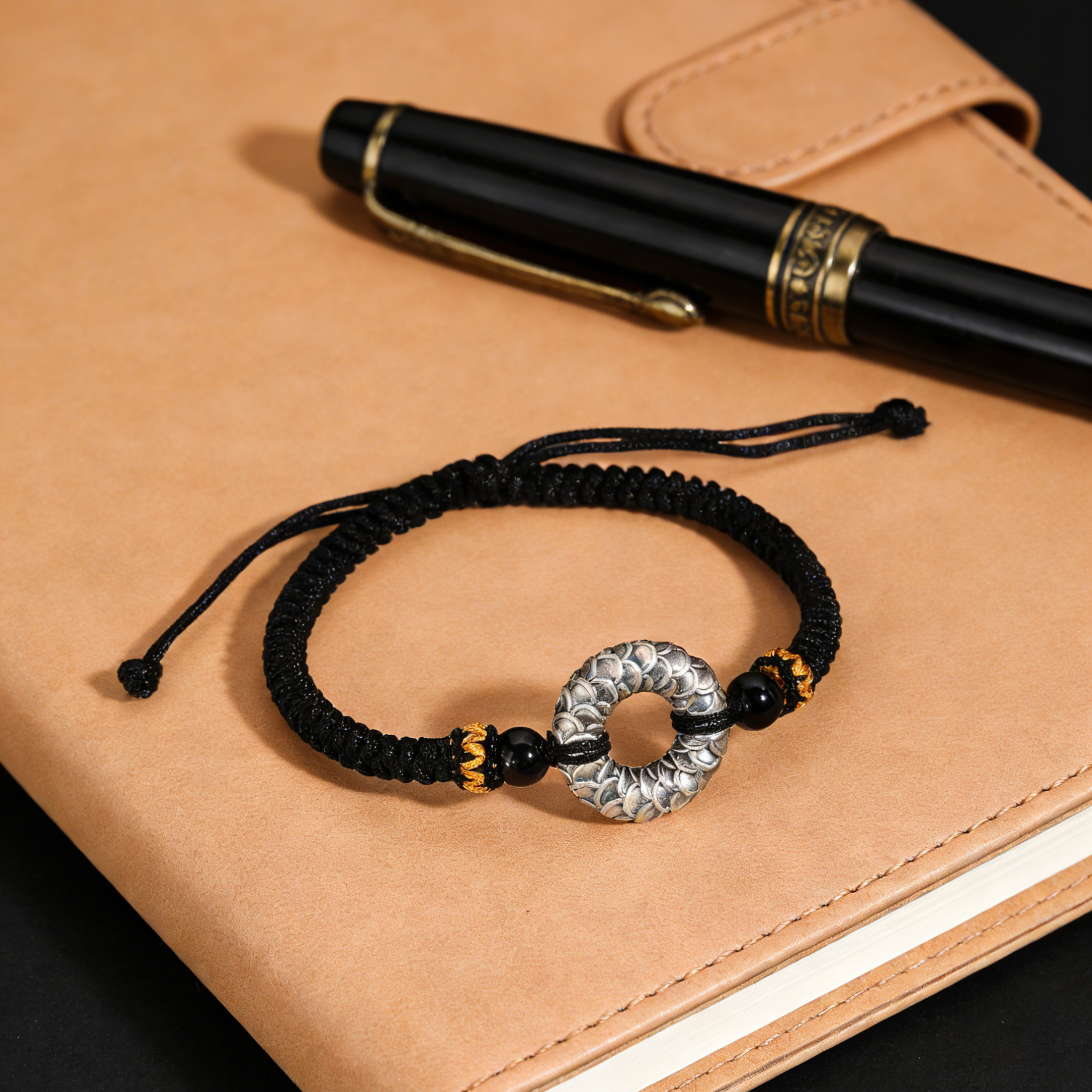 This bracelet is made of 999 sterling silver, which is hypoallergenic and has a long-lasting luster, suitable for people with sensitive skin. The dragon scale peace buckle is carefully carved with exquisite craftsmanship, every scale is clear and delicate, showing the unique texture of the dragon scale. The black cord is hand-woven by experienced craftsmen, with adjustable length, which can fit most wrist sizes. The bracelet also inlays black agate beads, which symbolize protection and stability in Western culture, adding more spiritual connotation to the bracelet.