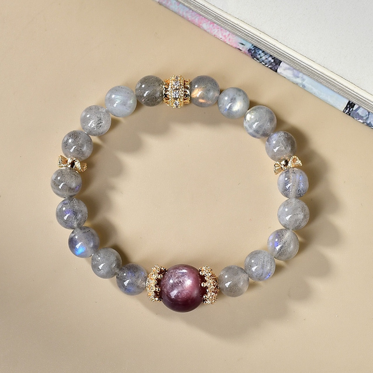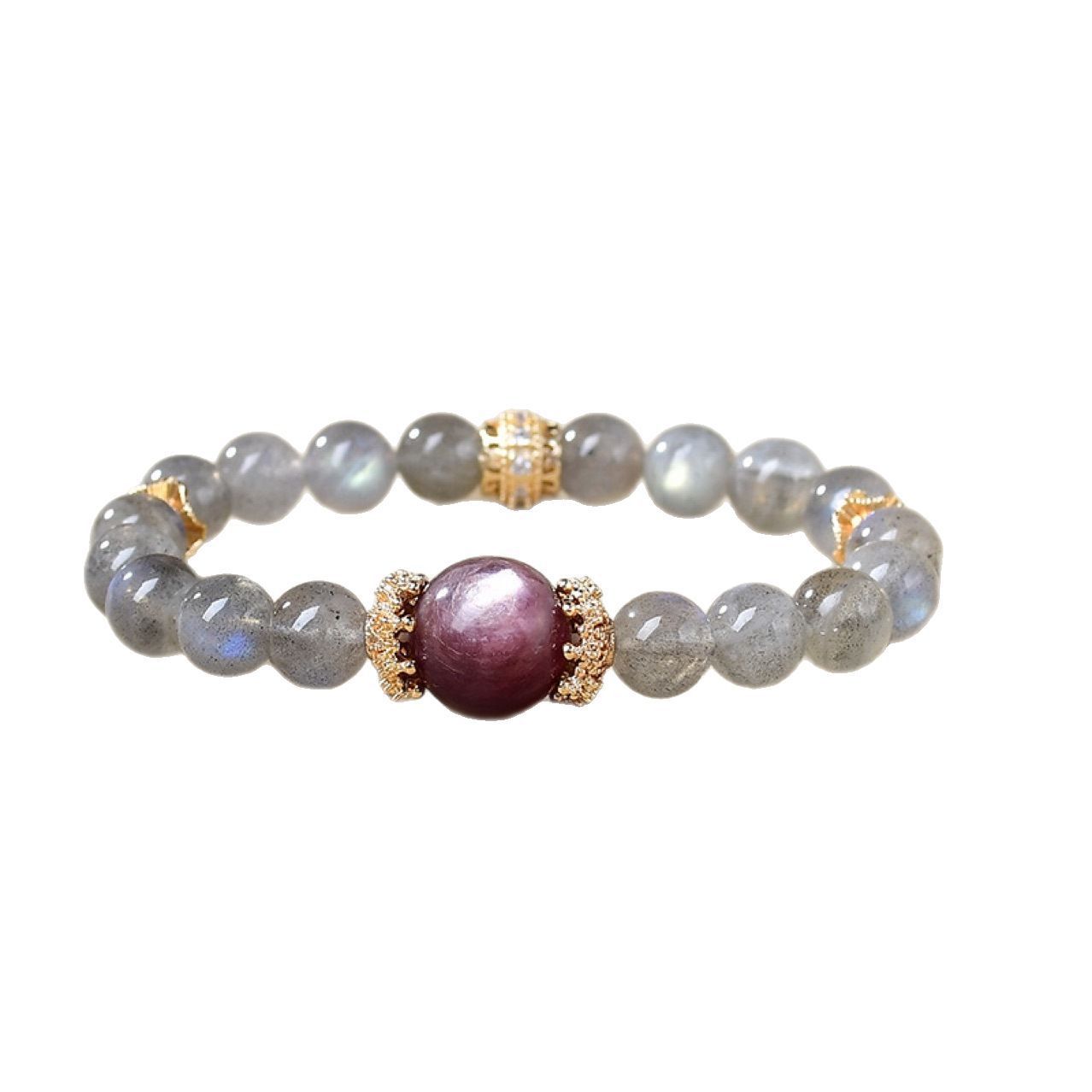 This bracelet is carefully handcrafted with natural grey moonstone beads and a central purple lepidolite bead, paired with exquisitely designed alloy accents. The grey moonstone beads have a unique adularescent effect, showing a soft glow under light, and each bead is carefully selected to ensure its quality and beauty. The central purple lepidolite bead has a deep purple color, with a subtle shimmer, adding a touch of luxury to the bracelet. The alloy accents are designed with intricate patterns, which not only enhance the beauty of the bracelet but also ensure its durability. The bracelet is elastic, suitable for most wrist sizes, and is comfortable to wear for a long time.