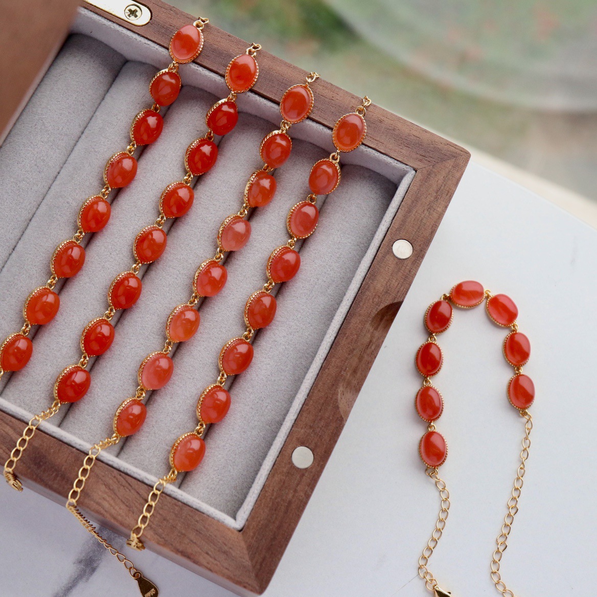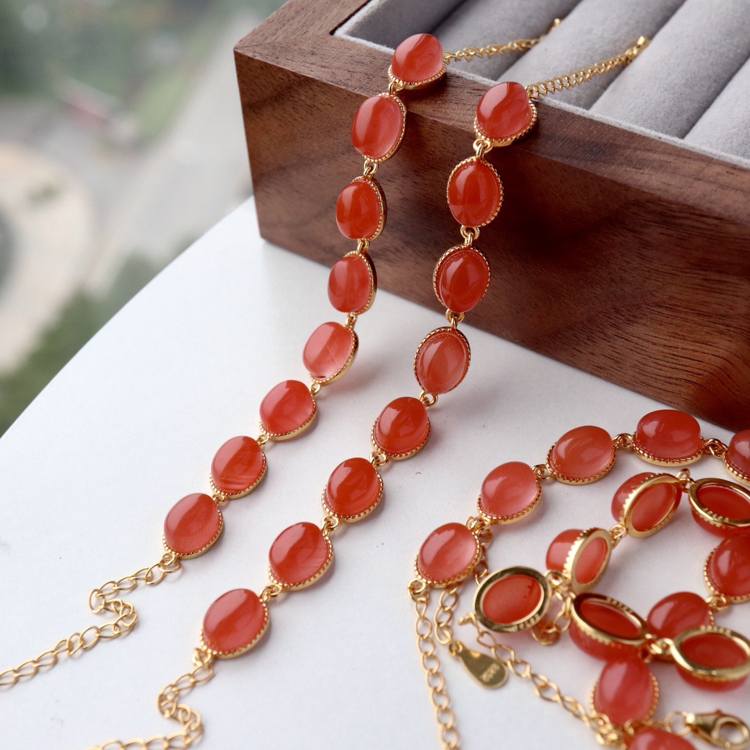 - Main Stone: Natural South Red Agate (Nanhong), each stone is 6*8mm, with a rich, saturated crimson color and unique natural texture, no two pieces are exactly the same.